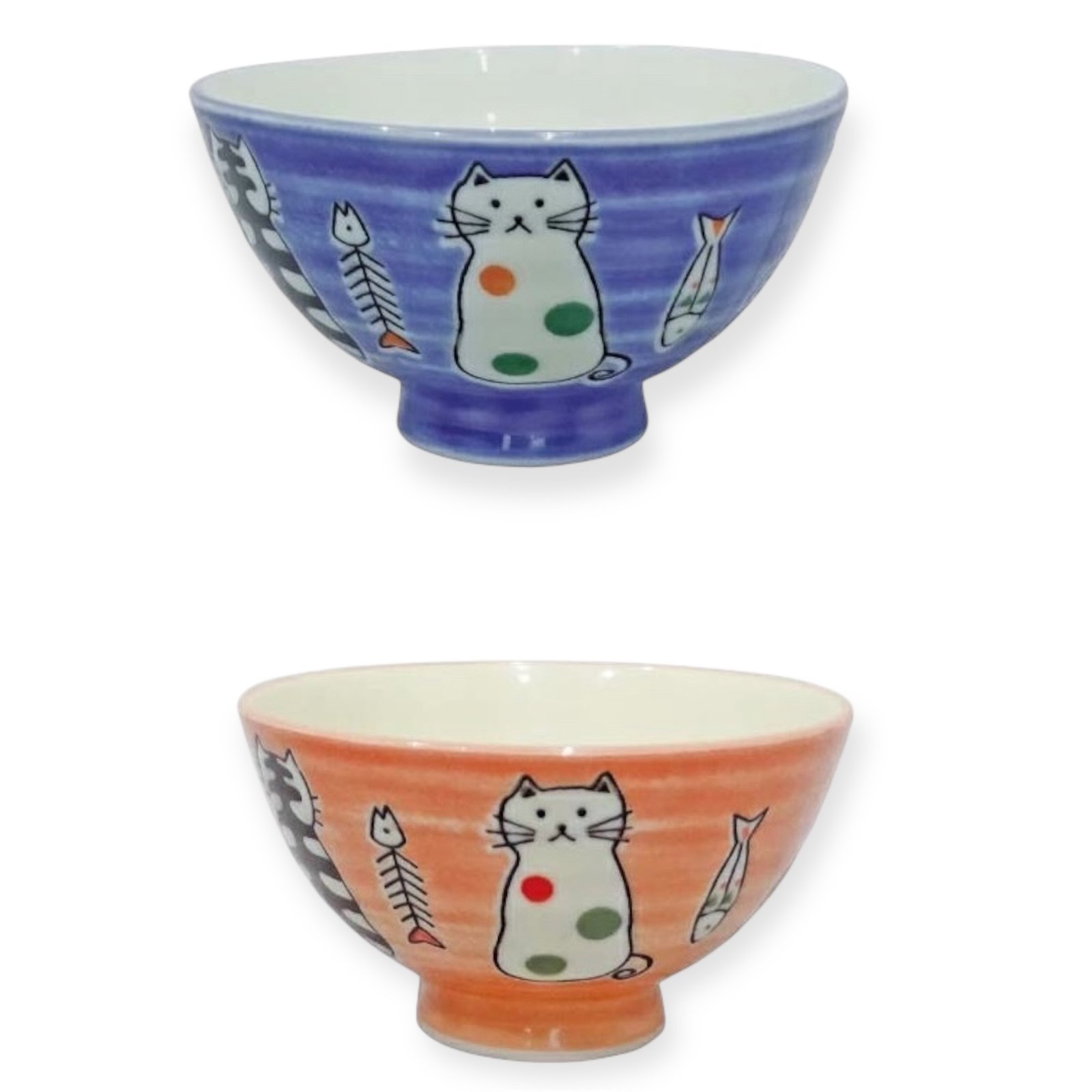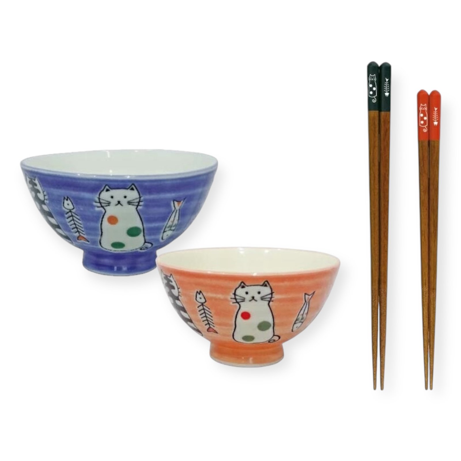 這款套裝包含可愛貓咪圖案的美濃燒茶碗和木筷子,共四件,是完美的成對禮物。