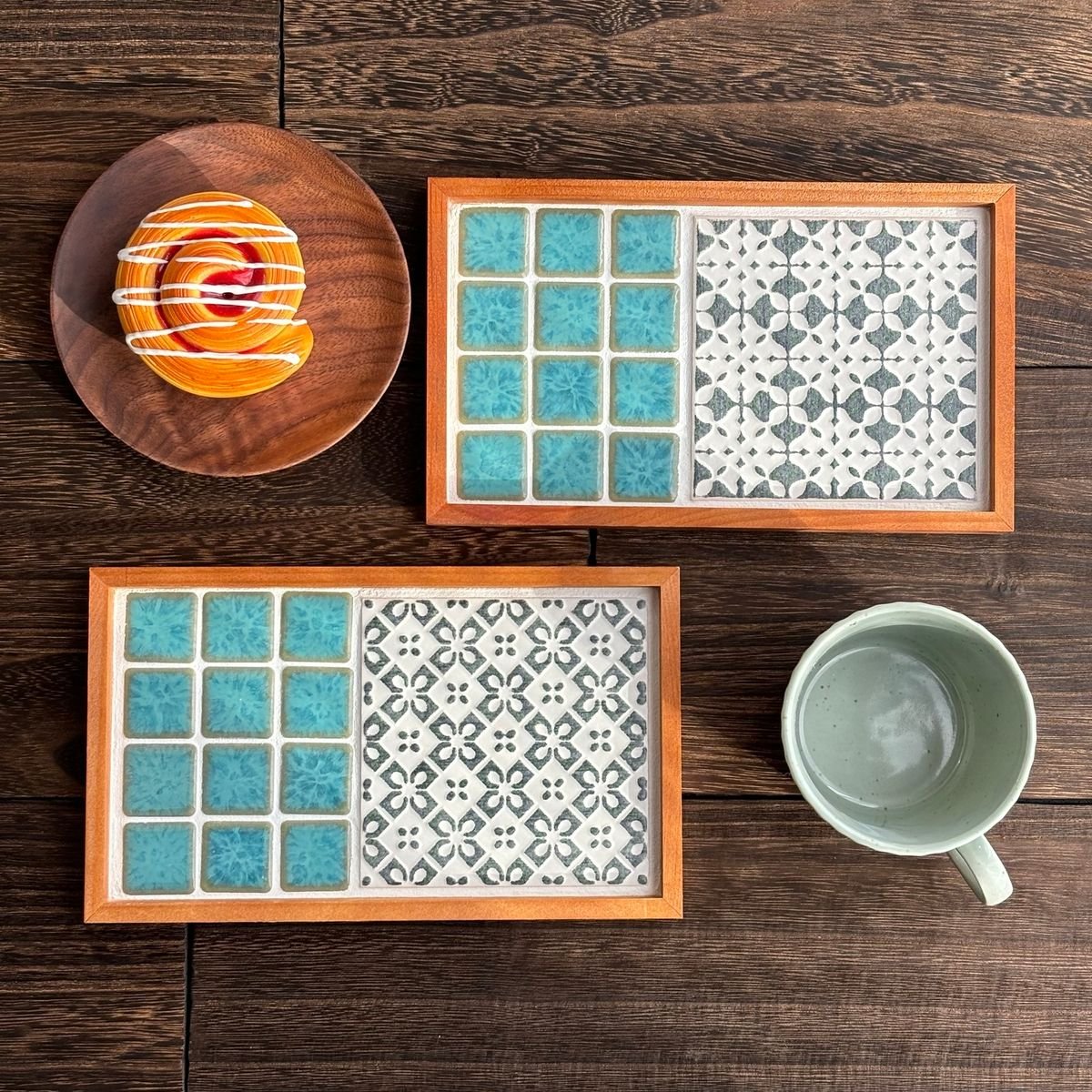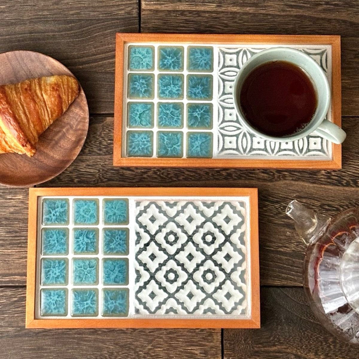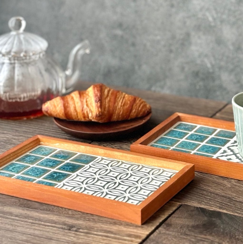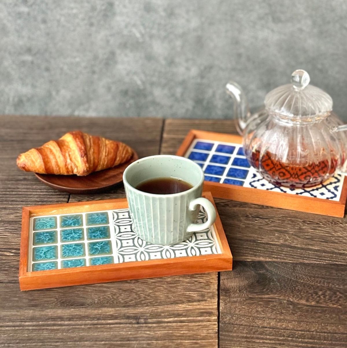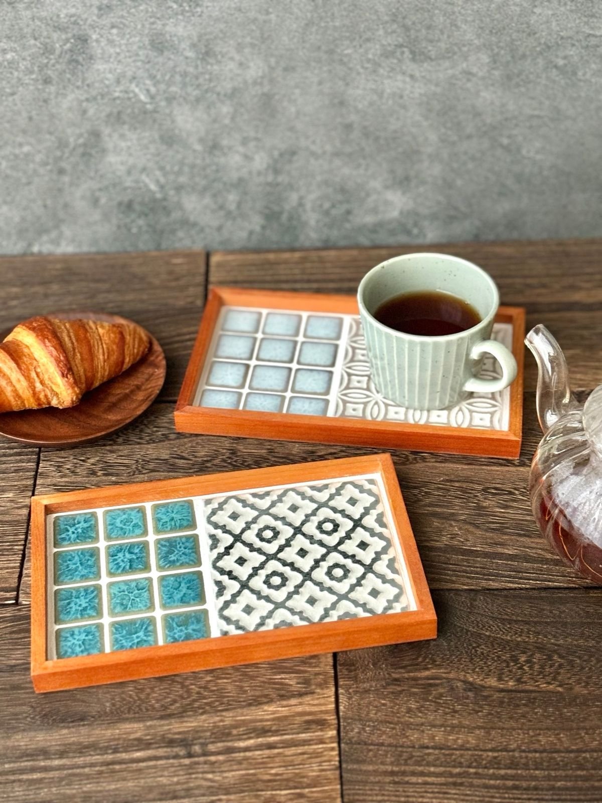 兩款不同設計的日本製 SATOMIMI 咖啡托盤放在木枱上,其中一款上面放着一杯咖啡,旁邊有一個裝着麵包的碟與一個咖啡壺
