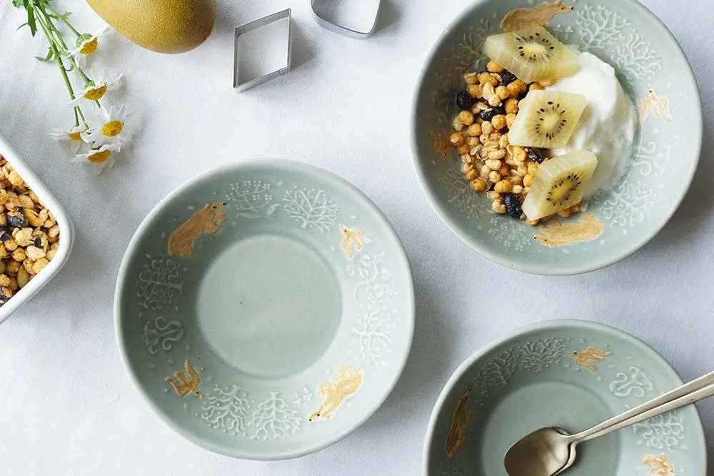 此款「薄綠(溫潤)」森林動物陶瓷碗,以漫步於繁茂樹林與花叢中的「熊」與「鳥」為設計主題,勾勒出充滿自然氣息的畫面,散發寧靜雅致的氛圍。碗身採用溫潤的淡綠色釉料,色調柔和略帶低調綠意,釉料中的細微成分在燒製後形成鐵點或藍點,點綴碗身,部分區域更可見釉料自然流動的痕跡或素坯白土的溫潤色澤,搭配以淺棕色釉彩勾勒的生動動物圖案,增添獨特質感與視覺層次。碗身深度適中,適合盛裝帶湯汁的菜餚或精緻甜點,栩栩如生的森林動物圖案為每一次用餐增添溫馨愉悅的體驗,讓您在品嚐美食的同時,感受大自然的輕鬆與美好。