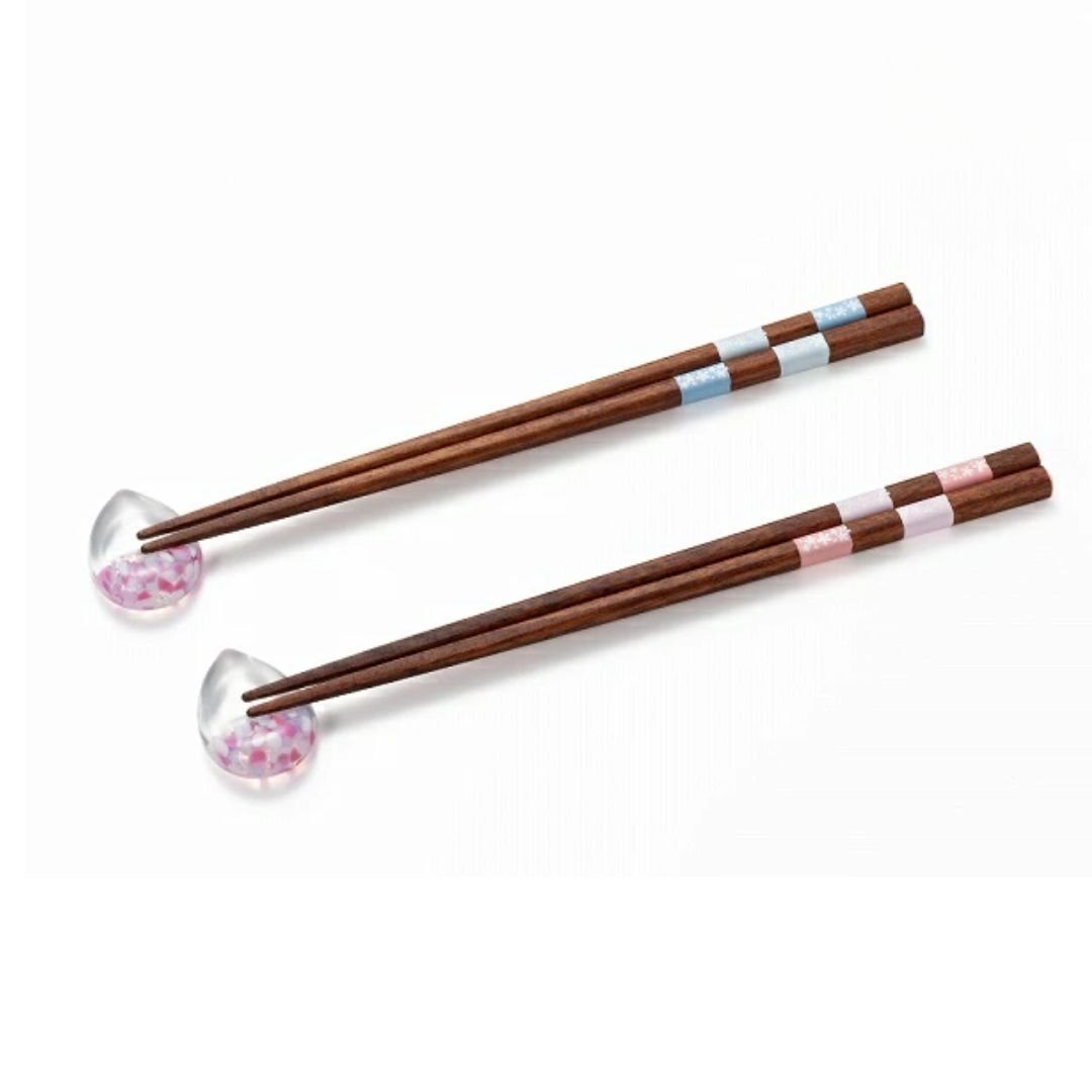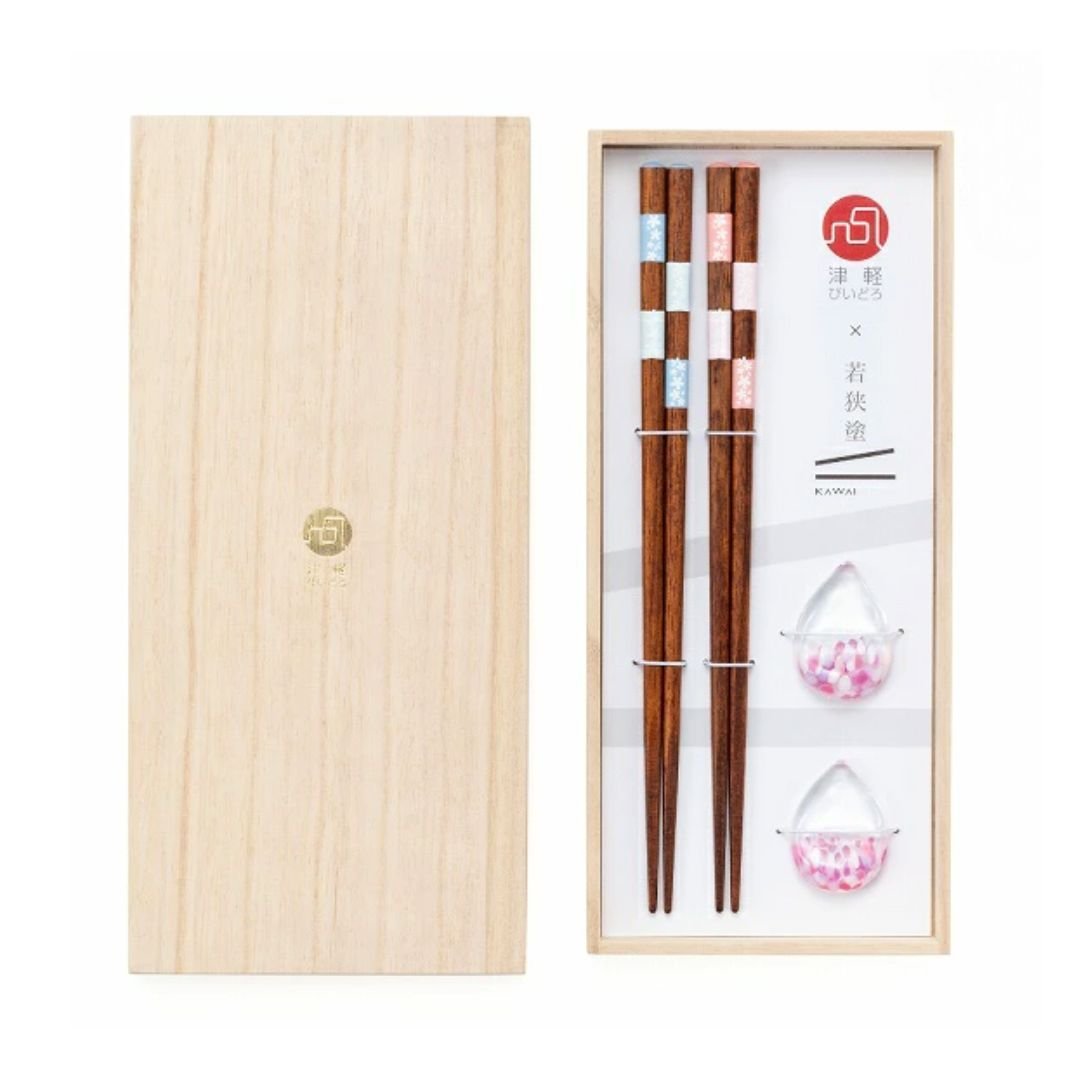 本套裝結合櫻花意象的津輕玻璃筷子架與福井縣小浜市出產的若狹塗筷子,展現優雅的日本餐桌美學。