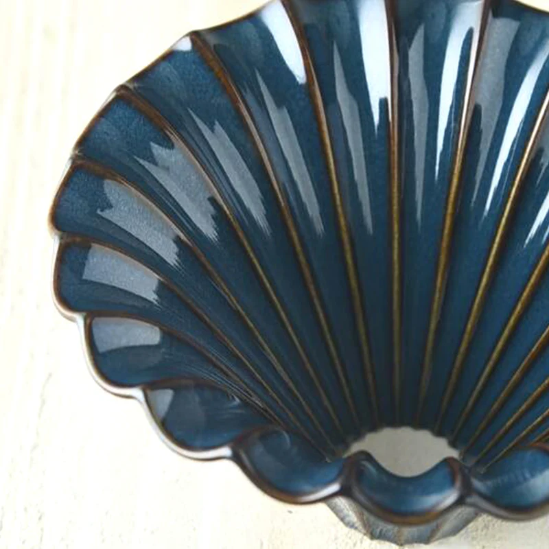 深藍色的瓷器部份能看到在陶瓷燒製過程中自然呈現釉色的變化。 呈波浪的花型設計讓咖啡能穩定地萃取出來,更能引出咖啡真味。 附設的木圈底座,不僅使觀感更顯優雅,也提供了穩定性和防熱的功能。