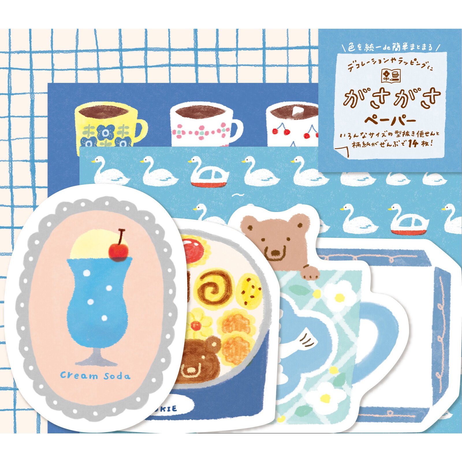 「嘎莎嘎莎」是日語中形容粗糙聲音的詞語,亦是和紙相互摩擦時的聲音。這套產品包含6張方形紙(3款設計,每款2張),8張模切紙(4款設計,每款2張),共14張紙。