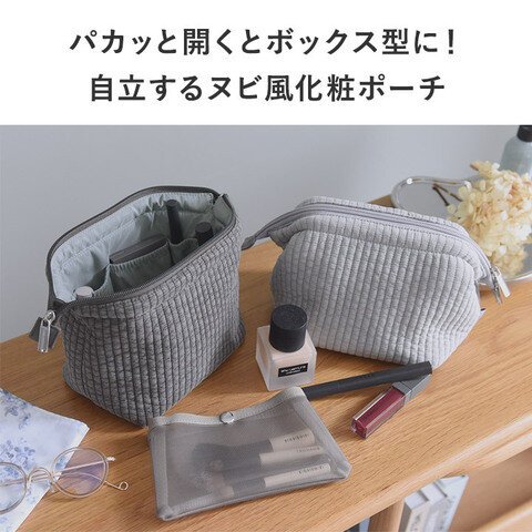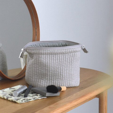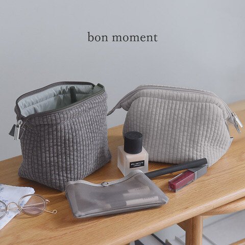 bon moment 仿韓式絎縫自立整理化妝包採用100%純棉,經特殊洗滌加工,呈現柔軟復古的絎縫質感,兼具美觀與實用性。化妝包尺寸為高15cm × 寬15cm × 底寬10cm,重量僅120g,輕巧便於日常或旅行攜帶。