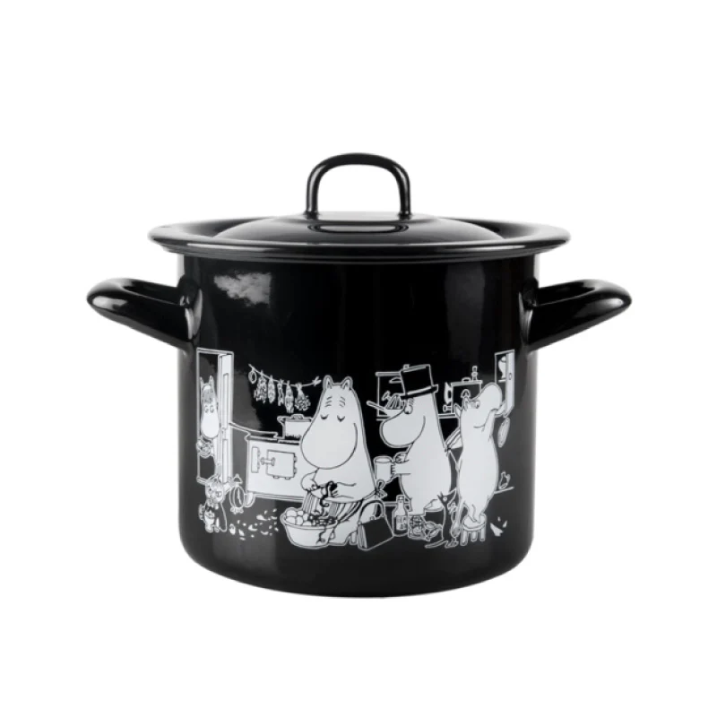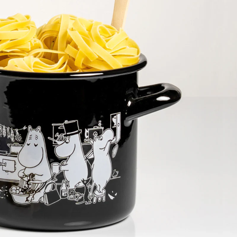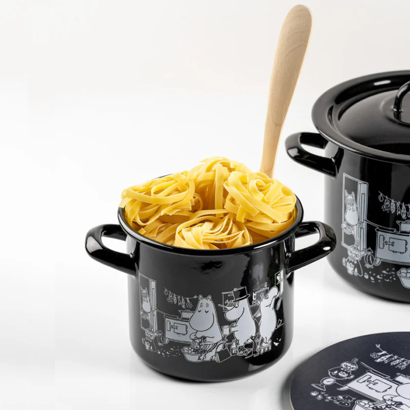 The black pot features black and white Moomin illustrations, highlighting a stylish feel that makes it irresistibly attractive. With a 1.5-liter capacity, it is suitable for use on IH induction cookers, ceramic cookers, open flames, and ovens. Each pot comes with an enamel lid.
