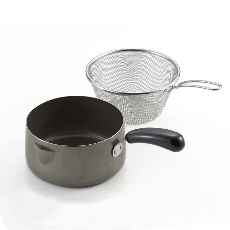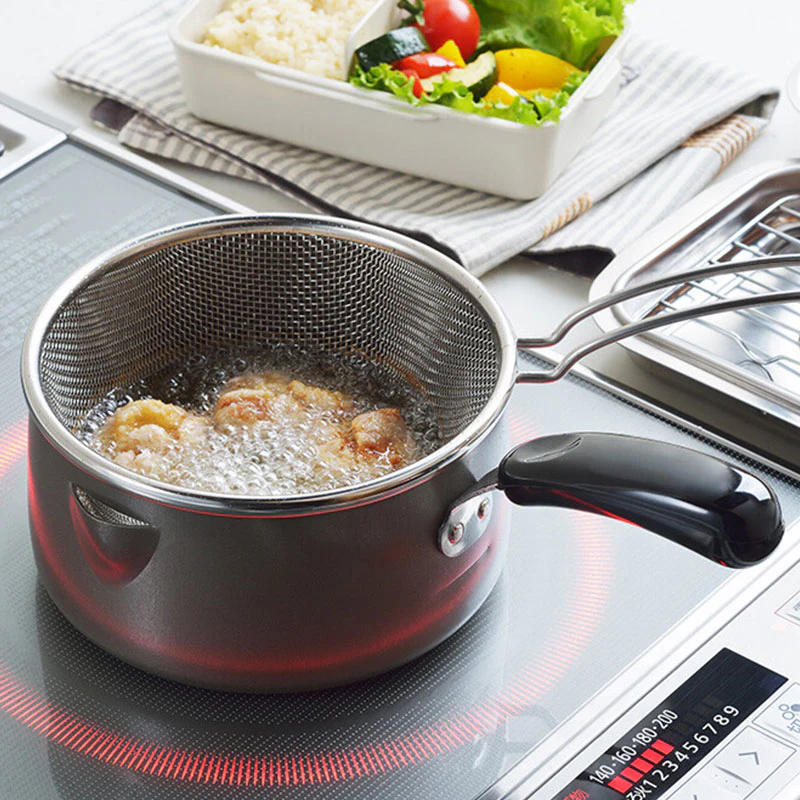 - The size of the strainer perfectly fits the pot. Easily scoop up the fried food.