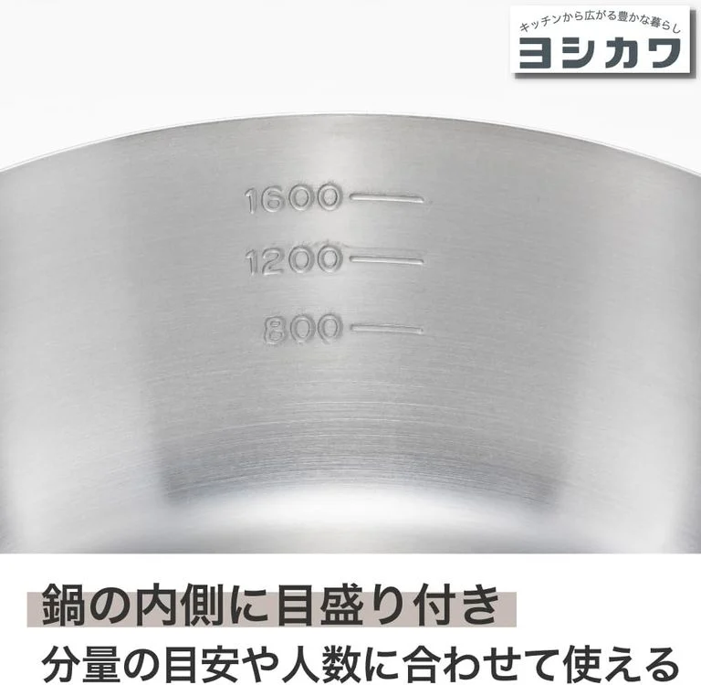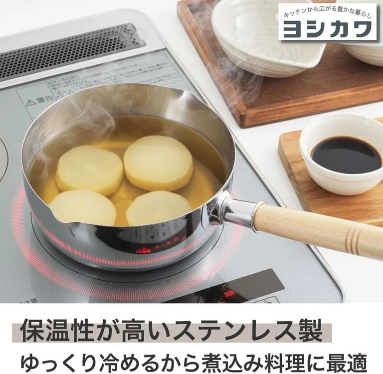 This Yoshikawa stainless steel single-handle pot with a lid features a central reinforced glass lid, allowing you to easily check on your cooking and boost efficiency. Its unique dual spout design makes pouring effortless for both left- and right-handed users. Inside, you'll find convenient markings at 200ml intervals for easy measurement of water and ingredients. The handle is crafted from warm natural wood, like beech, providing a comfortable grip and adding an elegant Japanese touch. Made in Tsubame-Sanjo, this pot ensures top-notch quality and craftsmanship.