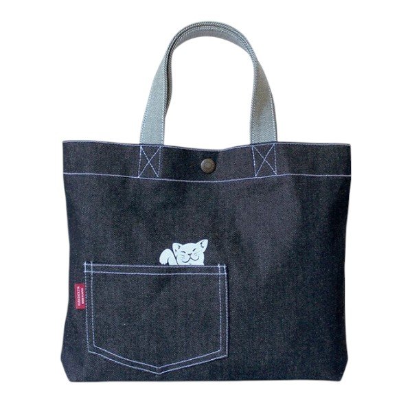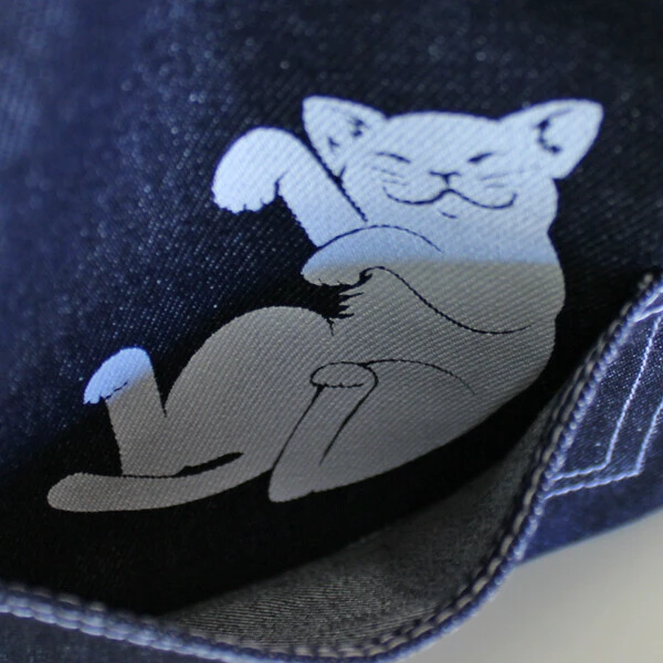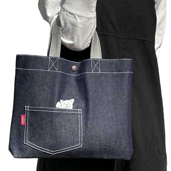 This small tote bag features a cute cat peeking out of the pocket as a design highlight. The hidden part is also printed with exquisite patterns, and there are practical pockets inside, making daily travel more convenient. The denim made in Kurashiki is tough and durable, and its unique texture will show more as it is used for a long time.