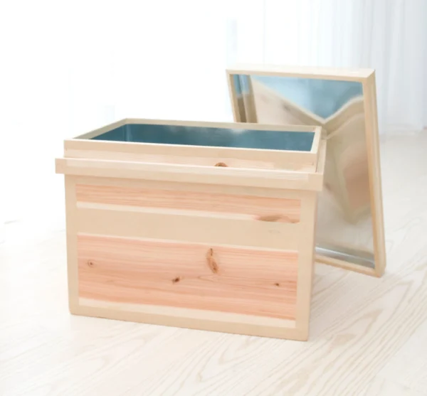 Materials: Japanese cedar wood, galvanized steel sheet, paper, bran (food-grade wheat starch adhesive)