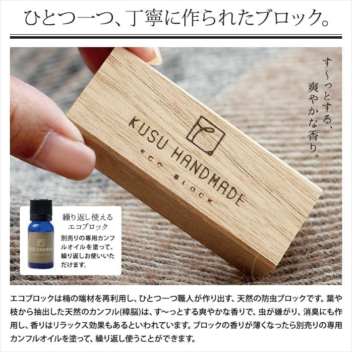 These insect‑repellent and deodorizing blocks are made from natural camphorwood sourced in Kyushu, Japan, with no chemical additives, making them safe, eco‑friendly, and ideal for everyday home use. They offer excellent insect‑repellent, anti‑mold, and deodorizing properties, and are especially well suited for wardrobes, shoe cabinets, bookshelves, and entryways—areas prone to humidity or unwanted odors. When the natural camphor scent begins to fade, simply lightly sand the surface to release fresh aroma again, extending the lifespan of the blocks. Each set contains approximately 30 camphorwood pieces; 3 to 5 pieces feature a branded burn mark, while the remaining pieces are unmarked, making the set perfect for use across larger spaces.