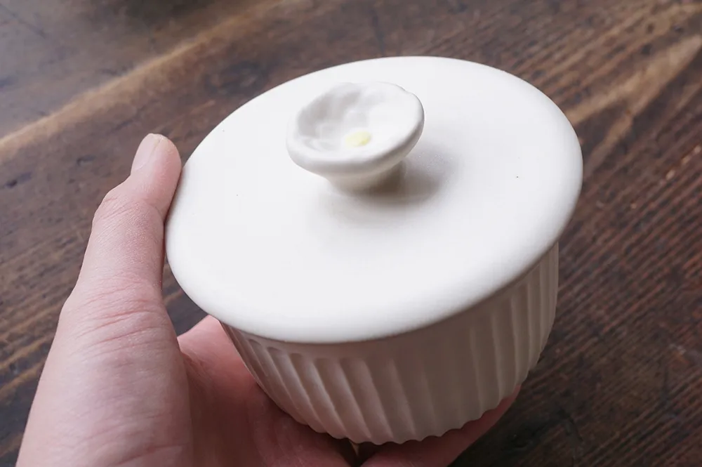 This elegant chawanmushi cup combines traditional Japanese craftsmanship with vintage European style. The smoothly glazed bowl features delicate embossed lines, while the lid's handle, inspired by a bird and rose motif, enhances its charm. An inner groove ensures optimal steam circulation for perfectly cooked dishes. Versatile and decorative, it also serves as a stylish container for salt, sugar, and other seasonings.
