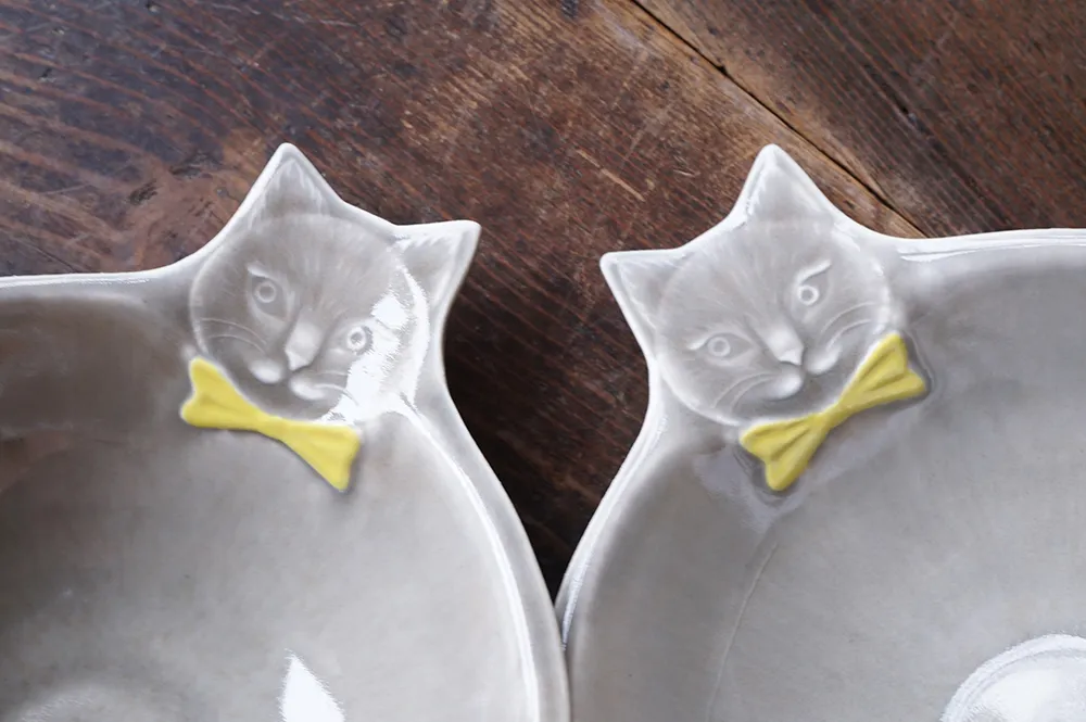 This charming flat cat bowl features a unique design, with the handle shaped like a cat's face and the bowl resembling a cat's body. The delightful tail design and stylish bowtie add an extra touch of whimsy ♪